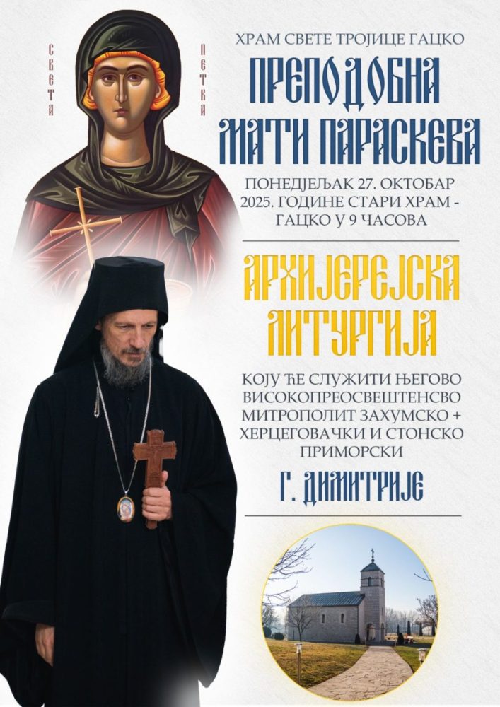 U ponedjeljak 27. oktobra na praznik Prepodobne mati Paraskeve (Svete Petke) u starom hramu u Gacku svetu arhijerejsku liturgiju služiće mitropolit Zahumsko – hercegovački i stonsko primorski g. Dimitrije.