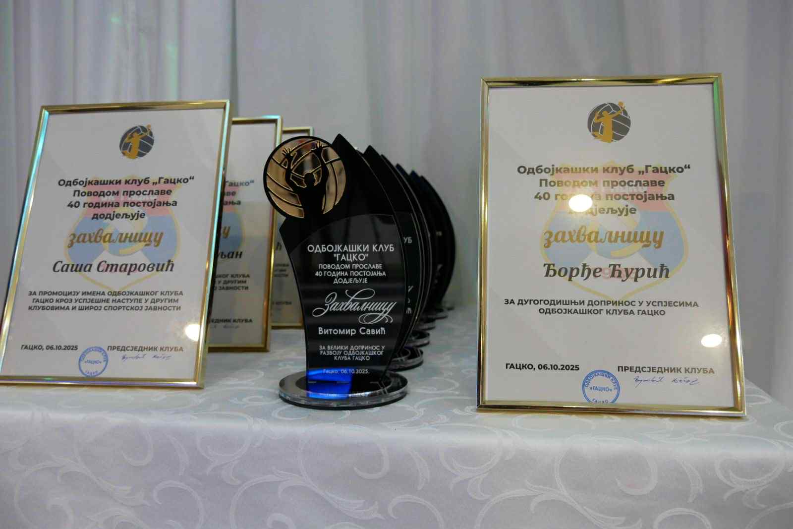Вече је било испуњено емоцијама, сјећањима и поносом на генерације које су прошле кроз клуб. Уручене су плакете и захвалнице заслужним појединцима и колективима, који су током година подржавали развој одбојке у Гацку, међу њима и Општини Гацко за дугогодишњу подршку спорту.