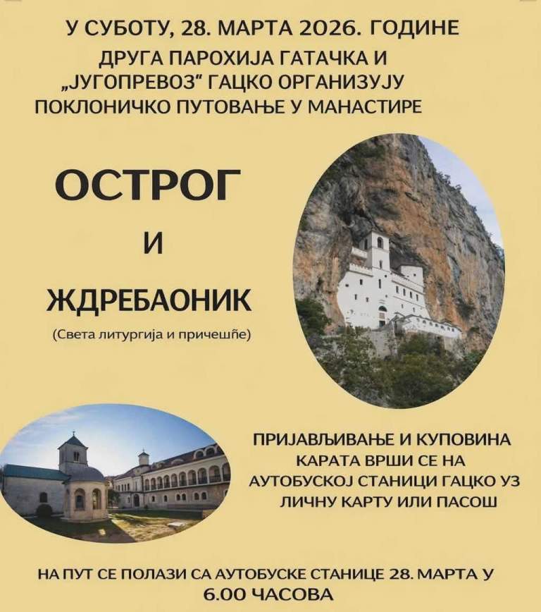 U susret najradosnijem hrišćanskom praznik Vaskrenju Gospodnjem, već tradicionalno u saradnji sa sveštenstvom i prevoznikom „Jugoprevoz“ Gacko, Parohija Druga gatačka organizuje pokloničko putovanje u manastir Ostrog u petu subotu Časnog posta, 28. marta.